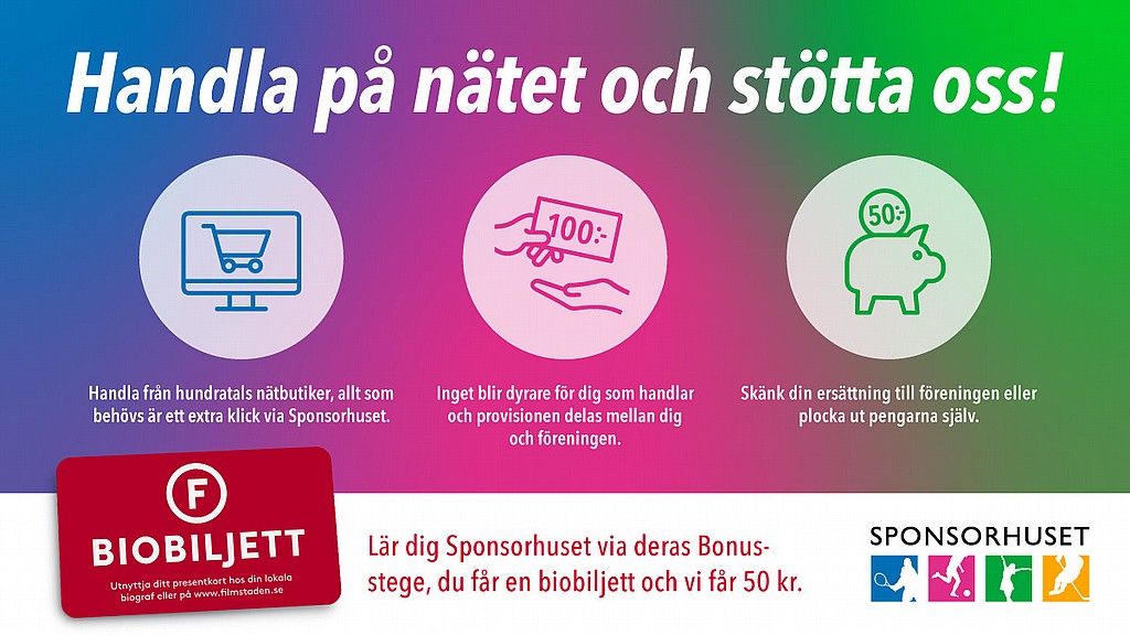 Genom att börja använda Sponsorhuset och gå igenom deras Bonusstege så får du en biobiljett och du stödjer Flemingsbergs IK med 50 kr!